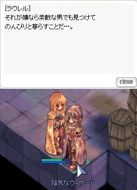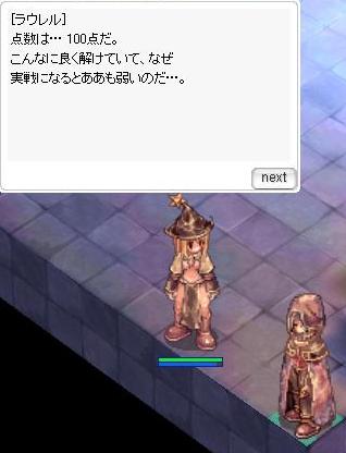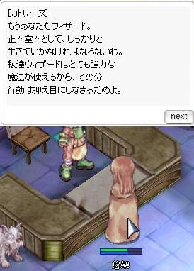 もう耐えられませっっ! 古い巻物持って行こうかと思いましたが、毎回最後のソヒーを 倒すところまでは行くのでもう一度と思って挑戦っ あと10秒のアナウンスが聞こえましたがなんとかクリア と思ったらすぐ次の部屋に>< 地の部屋の敵はアクティブが少なく軽く突破 そして最後火の部屋。ここはFD連発のみっ! 逃げながら・・・といってもみんな追っかけてくるよー 白ポにすればよかったかもと後悔しつつお魚連打でクリア♪ やったっ!なんとか転職できました~ そして筆記試験を行ってくれたwiz様に話しかけると っていうかあなたが素敵ですっ!熱い視線を送ってみました |