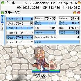 何焼きにするか、悩みちゅ どちらもおもちゃに篭ってあげています。まずはケミ自体をあげたいので壁ではなく共闘で戦っています ケミはこのままSTRに振り続けていくことに。足りなくなったらDEXと。AGIは止めです。 あっ、ラウドボイス忘れた。HSPも飲んでないやw まずはJOBカンスト目標! ホムっちは順調ですが、欲を言えばMatkが欲しいです。名前も付けたので愛着わいてきました♪ とりあえず目標は進化!そろそろ「気まずい」脱出してもいいかと ![]() レベル上げはケミと一緒にコツコツと・・・ 下水、ルティエ、おもちゃといろんなものに追いかけられましたw ルティエに行く雪原?アルデバランから飛んできてすぐ あせって何もできず・・・ 行くと必ずと言っていいほど出会うかも。 |